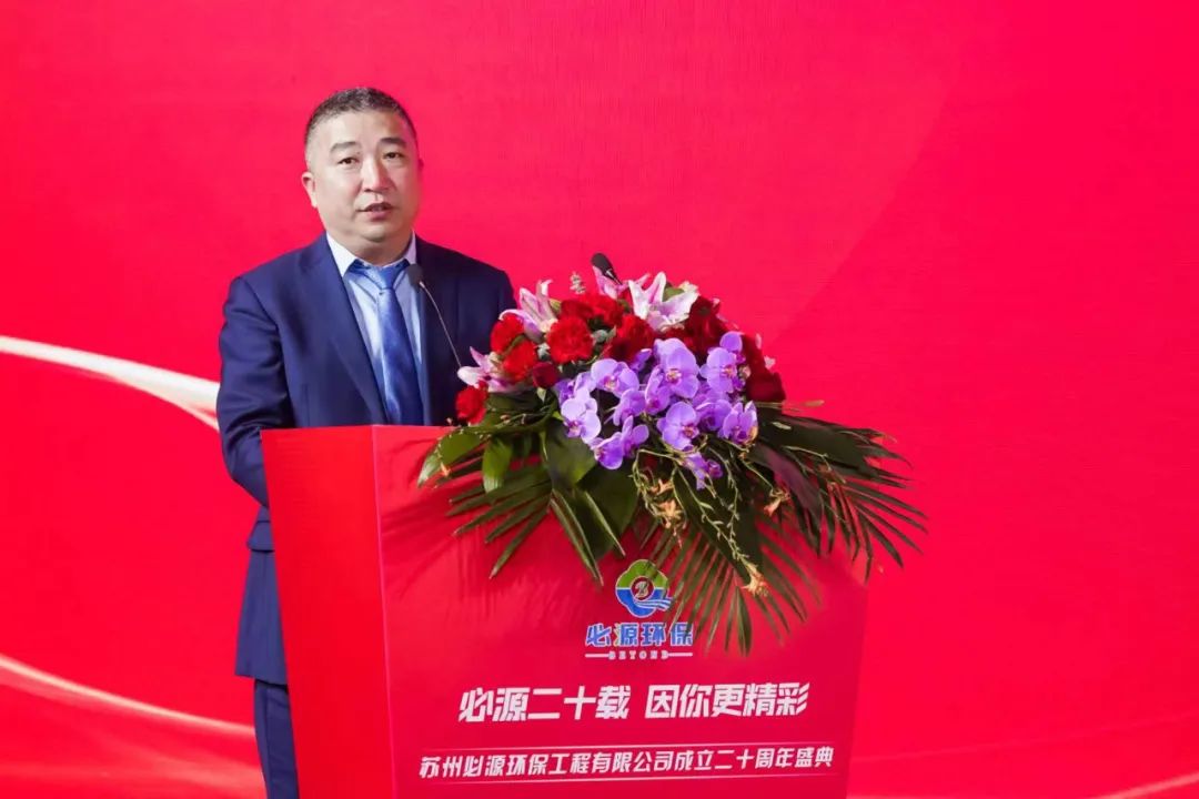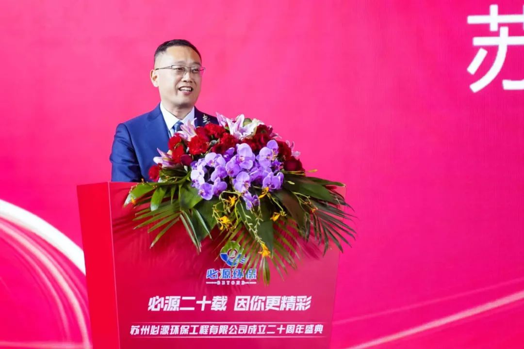 江蘇沙印集團董事長譚武斌先生發表了致辭,對必源環保取得的成就表示祝賀,他說道:回顧必源環保二十年發展歷程,總結過去,展望未來,我們因為一個行業、一群有共同夢想的人、走在了一起;共同的事業,一樣的追求,同樣的夢想,一樣的渴望!我們一起攜手同行,擁抱未來,一起走向成熟,一起收獲成功。并希望雙方未來能夠在更廣泛的領域展開合作,共同推動環保事業的發展。