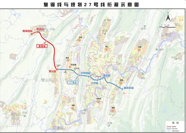 重慶軌道交通27號(hào)線是一條東西走向的軌道快線,西起璧山,東至重慶東站,將串聯(lián)起大學(xué)城、沙坪壩、大坪、南坪、茶園等組團(tuán),據(jù)公開資料顯示,軌道27號(hào)線項(xiàng)目正線全長(zhǎng)約 52公里,從璧山出發(fā),向東穿縉云山后,經(jīng)虎溪站、大學(xué)城南站、寨山坪站至西永站,后穿越中梁山至磁器口站、沙坪壩站,石橋鋪站、大坪西站,到達(dá)重慶菜園壩火車站,然后穿越長(zhǎng)江到達(dá)后堡和南坪站,后抵達(dá)茶園新區(qū)的重慶東站。27號(hào)線的定義是一條城軌快線。也就是說該條線路均為大站設(shè)計(jì),每個(gè)站點(diǎn)之間的間距較長(zhǎng),從而實(shí)現(xiàn)更少的停靠和更快的速度。27號(hào)線的高運(yùn)行速度高達(dá) 140km/h,已經(jīng)接近于目前的快速列車了。由此可見,27號(hào)線是串聯(lián)重慶主城東西走向的快速通道,對(duì)于完善主城的交通布局,分流一號(hào)線的壓力,具有重要的價(jià)值和意義。