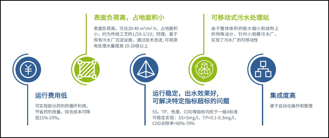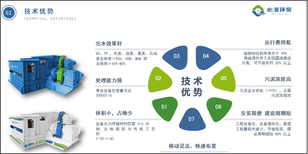該技術是通過向惰性污水中投加可循環利用的磁種,并在混凝劑和絮凝劑共同作用下形成磁絮凝體,然后利用稀土永磁磁盤產生的強磁場作用(磁力強度是其自身重量的600多倍),在瞬間(約2秒鐘內)實現污水固液分離的過程,來達到消除污水中絕大部分污染物的目的。