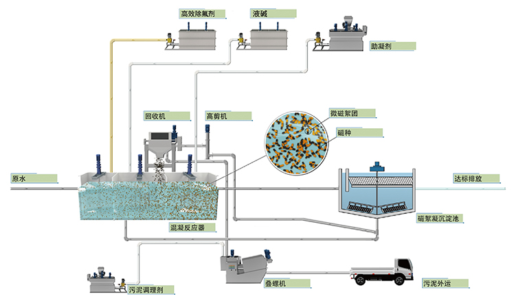 其中,在關(guān)鍵工藝“二級除氟沉淀池”段采用了一套50000T/d磁混凝沉淀配套水處理設(shè)備。該設(shè)備依據(jù)重介質(zhì)加載沉淀原理,通過向污水中投加適量可循環(huán)利用的磁種,并使磁種均勻分散到水體中形成微小晶核,以此強(qiáng)化絮凝效果,并最終形成高密度絮凝體(磁種密度為水密度的5.1倍),依靠重力作用和斜管(板)沉淀原理實(shí)現(xiàn)固液的高速沉淀分離。同時輔以部分污泥回流系統(tǒng)以增強(qiáng)去除效果和降低藥劑費(fèi)用。